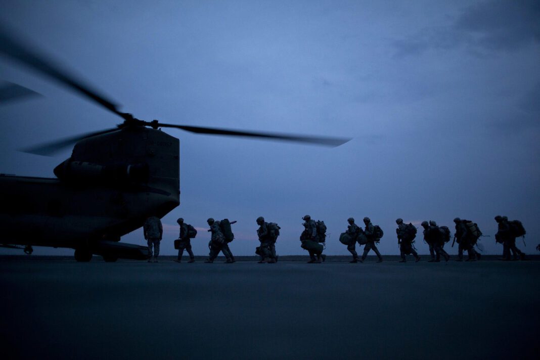 FILE -- Soldiers board a transport helicopter at a base in Kunduz, Afghanistan, March 6, 2011. What no one knew in 2001 was that Operation Enduring Freedom, the invasion to rout al-Qaida and its hosts, the Taliban, from Afghanistan would turn into a war that is now in its 20th year — America’s longest. (Damon Winter/The New York Times)