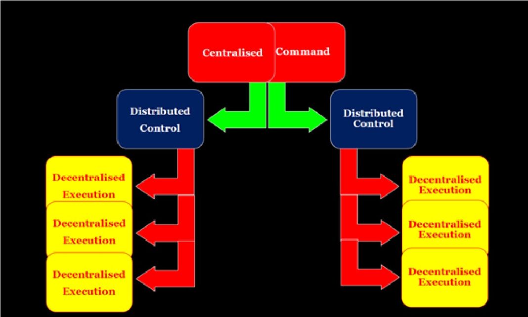 It refers to a system where individual squadrons or units have a high degree of autonomy in the execution of their missions. This type of control is often used in highly dynamic and rapidly changing environments at the field and tactical level, where units must respond quickly to changing circumstances. The advantage of decentralised execution is that it allows for highly agile decision-making, with units innovating their own tactics and execution as they can respond immediately to evolving circumstances. However, it can also lead to a lack of coordination between other units in the same area of responsibility, especially in the TBA, making it challenging to achieve a comprehensive objective.