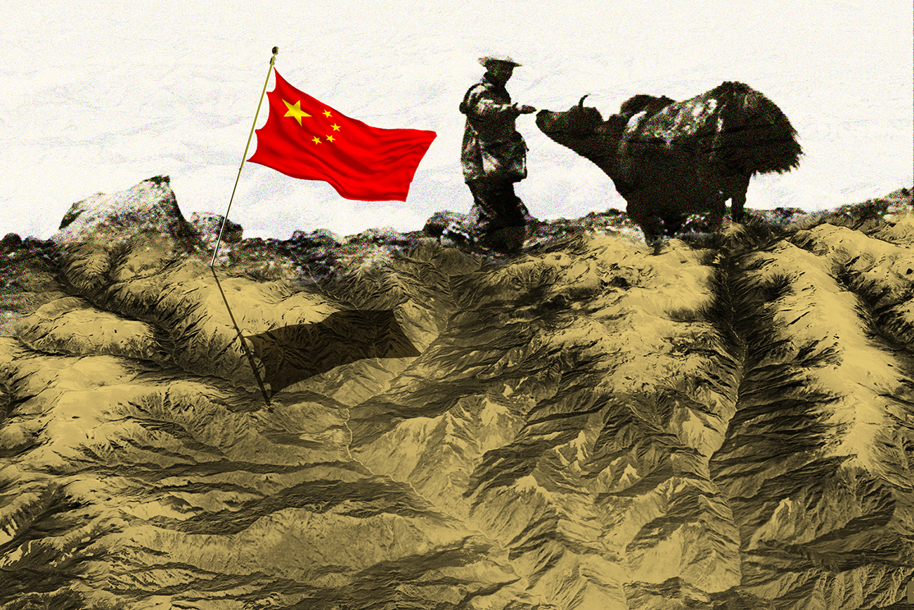 A Tibetan herder and yak on July 4, 2020, in a composite satellite illustration of the Tibetan and Bhutanese border region. Foreign Policy illustration/Tibet Satellite TV+