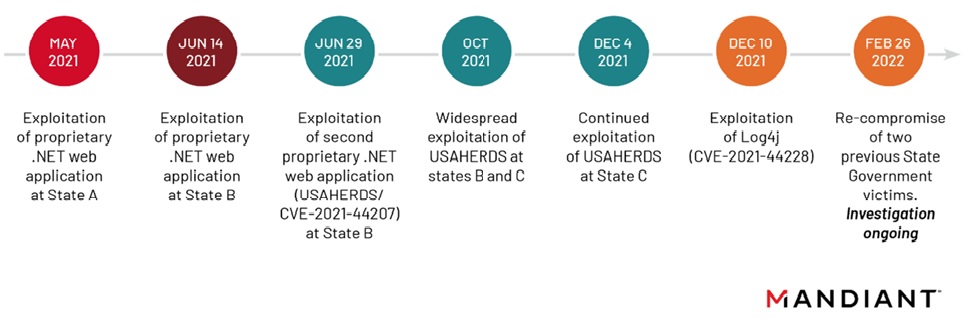 Earlier it was involved in exploiting the vulnerabilities, and mass scanning but it is expanding its target audience and range. The US government has uncovered that it is actively involved in activities that directly affect and harm state governments. APT 41 tried to exploit a vulnerability through a SQL(Structured Query Learning) injection and was countered by Mandiant Managed Defense. In a series of attacks that followed between the two, it was identified that they had been exploiting various kinds of vulnerabilities, especially in commercial applications. Furthermore, it has been quick on the part of its operations as it picks on the publicly available vulnerabilities and adapts to its needs in no time. They have been increasingly trying to penetrate the state government structure. Mediant released the following chart to map out the series of attacks.[iii]