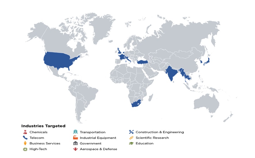 The US alone is not on the radar of such attacks. India too has come under cyber-attacks from APT 41 in the past. In 2021, BlackBerry Research and Intelligence researchers identified a series of phishing attacks that targeted victims in India. These contained data about new tax legislation and COVID-19 records and statistics. They masqueraded as the Indian government to maintain its credibility.[vi] They have targeted many pro-democracy activists and countries like Hong Kong, France, Japan, Myanmar, Italy, Thailand, Turkey, Singapore, South Korea, the UK, Switzerland, South Africa, and Vietnam. A report by FireEye also found them responsible for some of the most exploitative supply chain attacks, where they exploited profiles available in the public domain to appear as legitimate network traffic, like the ones that come from Gmail, Amazon, and OneDrive. [vii] The following map was shared by FireEye in its report that points out countries where the attacks have been rampant, along with the list of industries that they target.
